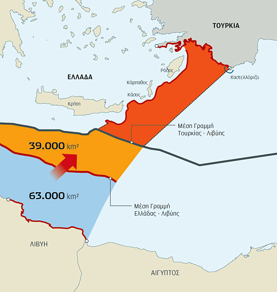 Η Τουρκία με τη σειρά της[20], από τους ορισμούς για Υφαλοκρηπίδα και ΑΟΖ «θυμάται» μόνο την αναφορά στην Υφαλοκρηπίδα ως «φυσική προέκταση της στεριάς στη θάλασσα», που έχει πλέον καταργηθεί. Ισχυρίζεται –επικαλούμενη και κάποιες αποφάσεις δικαστηρίων για άλλες αντίστοιχες περιπτώσεις- ότι τα ελληνικά νησιά του ανατολικού Αιγαίου είναι πάνω στην φυσική προέκταση των ακτών της, συνεπώς δεν έχουν Υφαλοκρηπίδα. Κατά τη γνώμη της αυτή μπορεί να οριστεί μόνο με την αρχή της μέσης γραμμής μεταξύ των ηπειρωτικών ακτών των δύο χωρών. Με τον τρόπο αυτό, χαρίζει στον εαυτό της το μισό Αιγαίο. Οι ισχυρισμοί της ωστόσο είναι αστήριχτοι, κυρίως επειδή τα νησιά του ανατολικού Αιγαίου ούτε μεμονωμένα είναι ούτε αποκομμένα από την ηπειρωτική Ελλάδα, όπως σε άλλες περιπτώσεις που έχουν εκδικασθεί. Αντίθετα, αποτελούν μέρος 3.000 και πάνω νησιών του Αιγαίου (κατοικούνται περίπου 150). Η διαμόρφωσή τους, παρότι δεν κατατάσσει την Ελλάδα σε ένα αρχιπελαγικό κράτος, αποδίδει σε αυτήν την ιδιότητα μιας νησιωτικής σε μεγάλο ποσοστό χώρας. Οι Τουρκικές θέσεις, παίρνουν την ακραία τους μορφή όταν αγνοούν το σύνολο των ελληνικών νησιών (Ρόδος, Κάρπαθος, Κρήτη κλπ.), καθώς σε αυτή την περίπτωση ζητούν την οριοθέτηση των ΑΟΖ με βάση την αρχή της ίσης απόστασης από τις ακτές Λιβύης, Αιγύπτου και Λιβάνου, μοιραζόμενη έτσι αυτή την Ανατολική Μεσόγειο, με αποκλεισμό Ελλάδας και Κύπρου. Στο παρακάτω γράφημα φαίνεται ο διαμοιρασμός της ΑΟΖ μεταξύ Τουρκίας-Λιβύης με «παράκαμψη» των ΑΟΖ Κρήτης, Ρόδου, Καρπάθου κλπ. (ως νησιών που σύμφωνα με την Τουρκική θέση πρέπει να αγνοηθούν)[21]